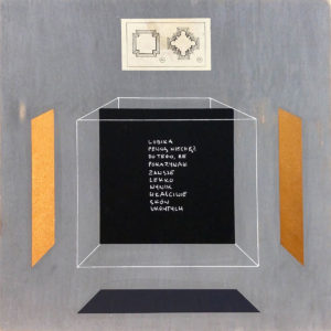 LUBIŁA…, tusz, akryl, collage, deska, 30×30 cm, 2020 r.