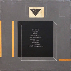 MY KNEES…, tusz, akryl, collage, colowood, płótno, 40×40 cm, 2020 r.