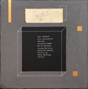 THE SURFACE…, tusz, akryl, collage, colowood, płótno, 40×40 cm, 2020 r.